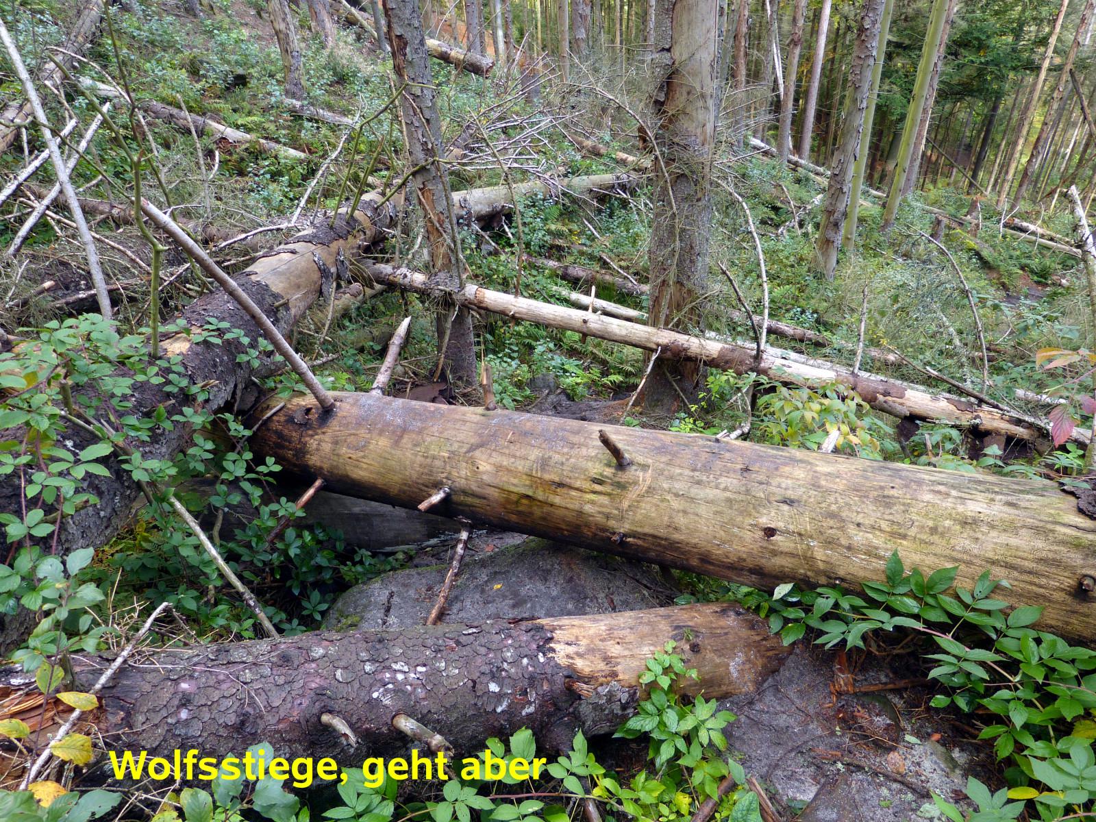 Am Hang gleich an der Felsenmühle begrüßte uns erst einmal das übliche Fichtenmikado: